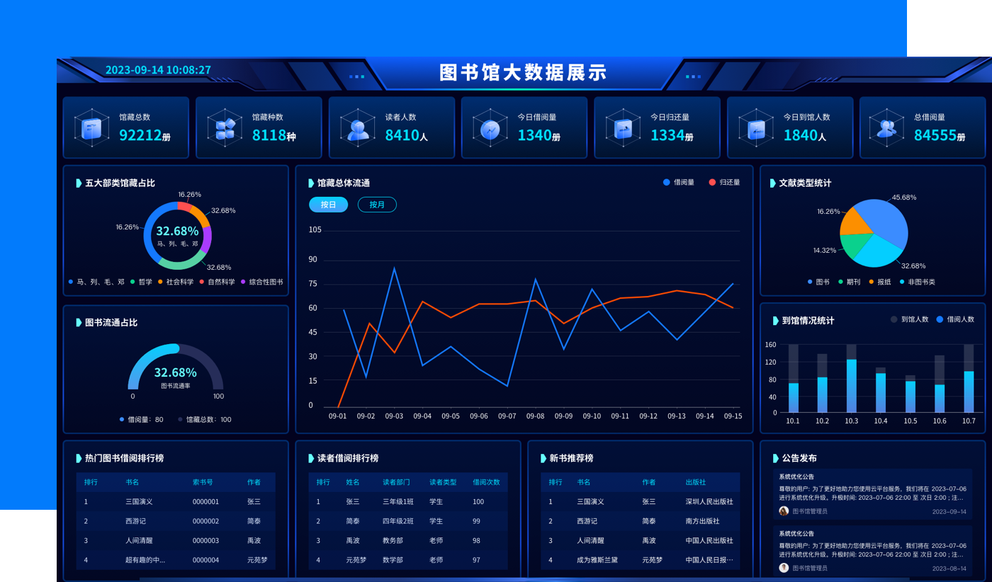 利用物联网、大数据等技术,实现图书自动化管理、智能检索与个性化推荐服务。用户可通过移动设备自助借阅、续借图书,享受便捷高效的阅读体验。