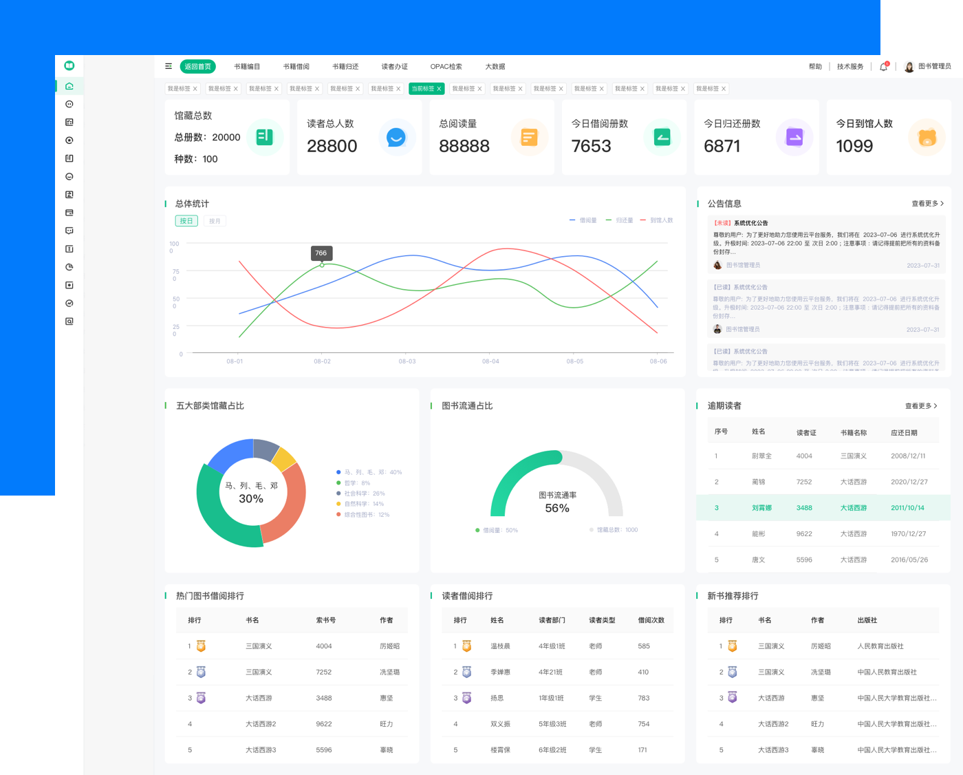 智能分析 生成各类统计报表,帮助馆员掌握图书馆使用情况,辅助决策